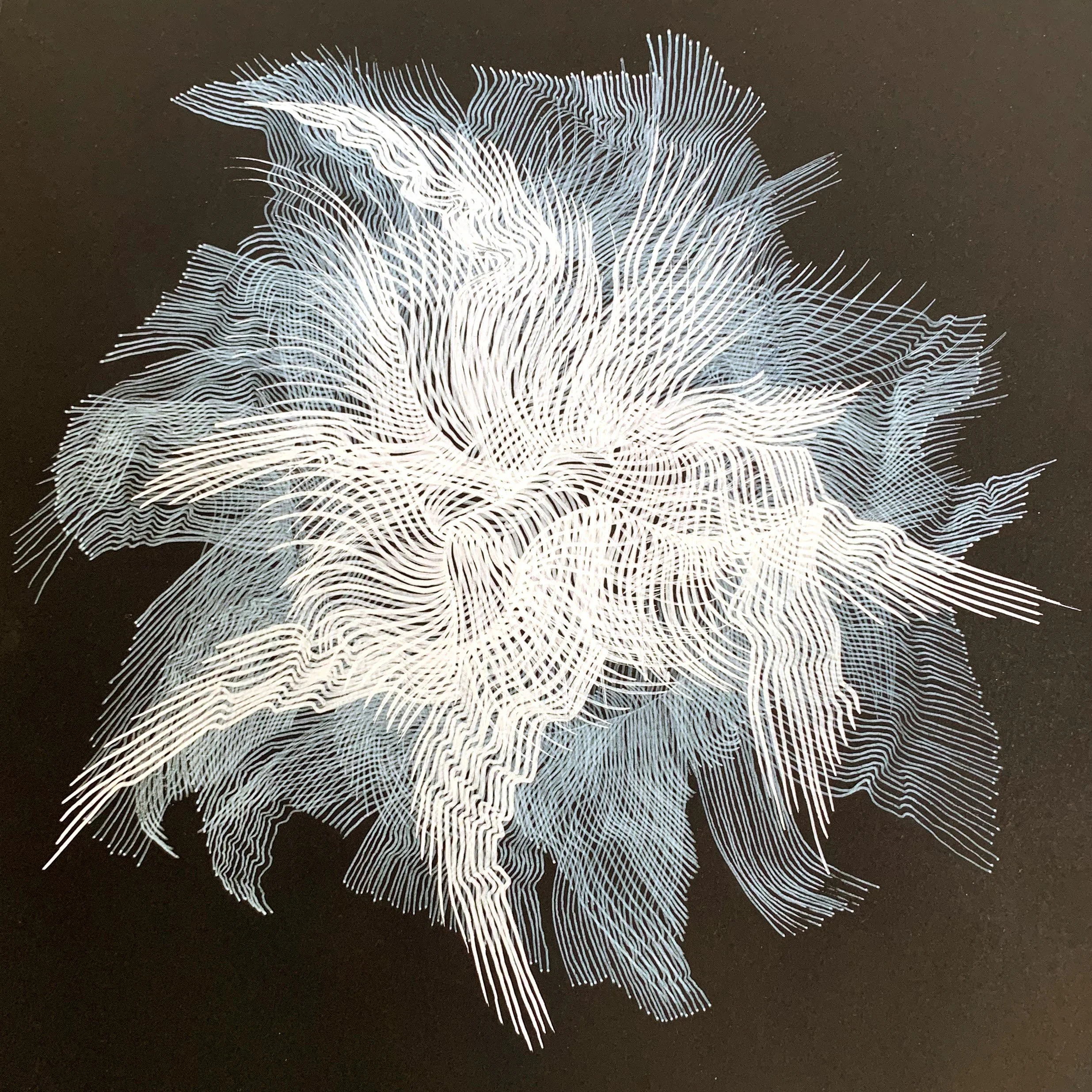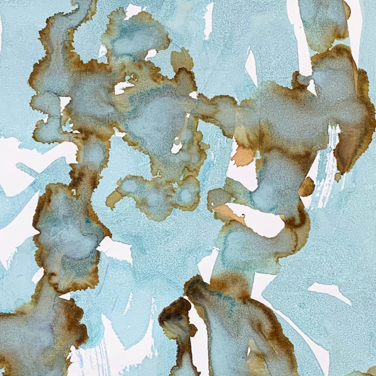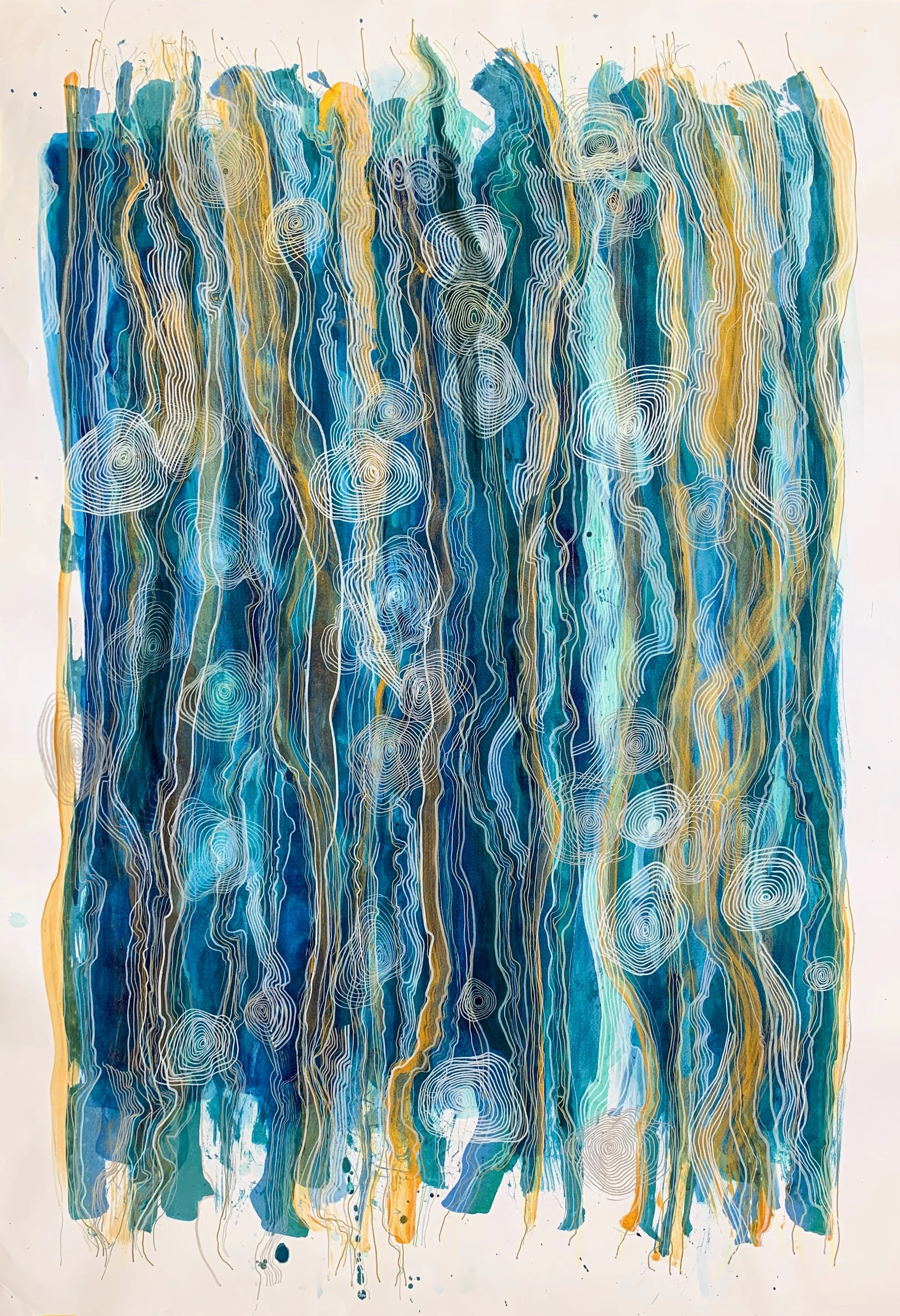 Jo’s work offers an original visual language for telling stories of water. Her unconventional choice of tools such as seaweed, feathers, stones and small pieces of driftwood combine with her hand made ink hues to produce unique marks in her abstract seascapes. Jo encourages sediments in the ink to swirl and settle in rivulets and banks, rendering aquatic microcosms.